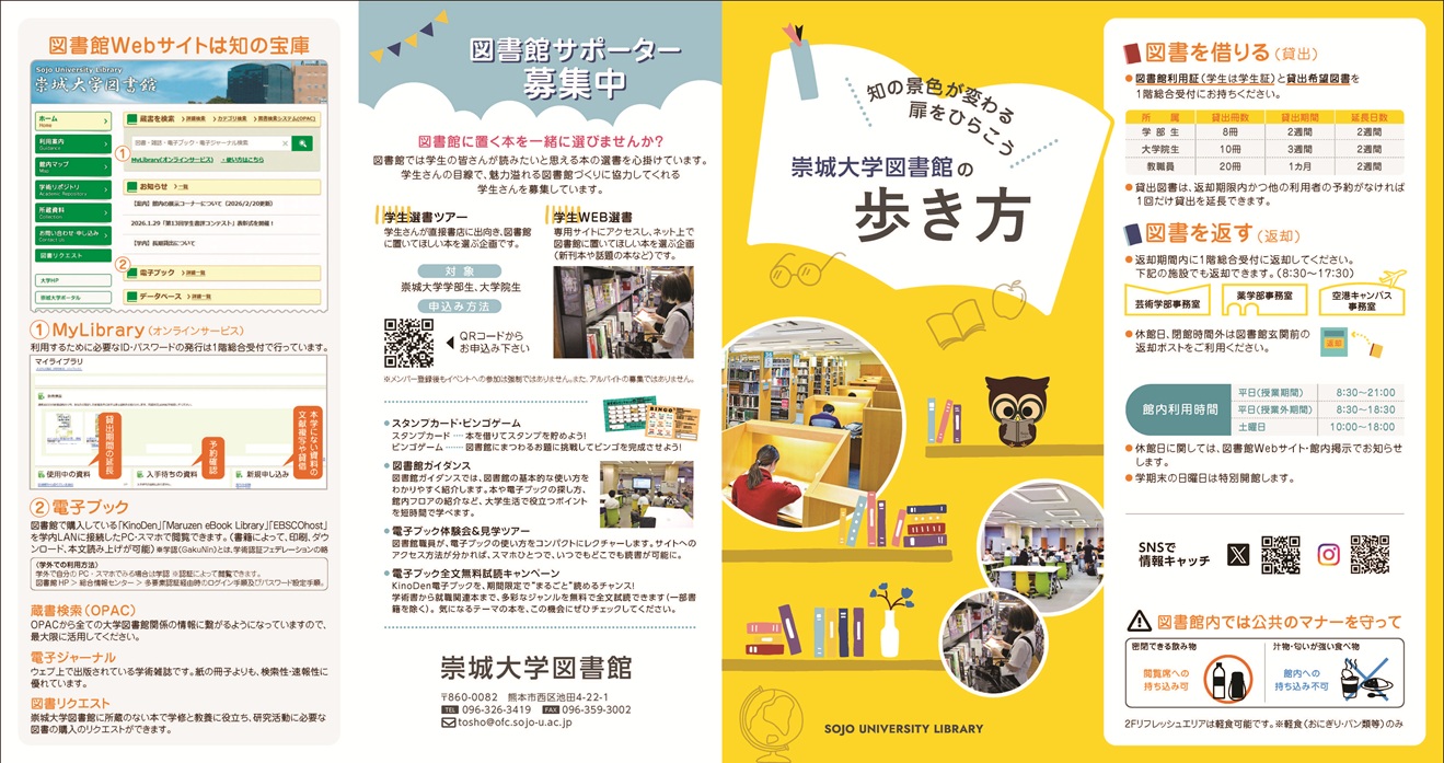崇城大学図書館 電話(代)096-326-3419/メール tosho(@)ofc.sojo-u.ac.jp (@)は小文字@に変更してください。